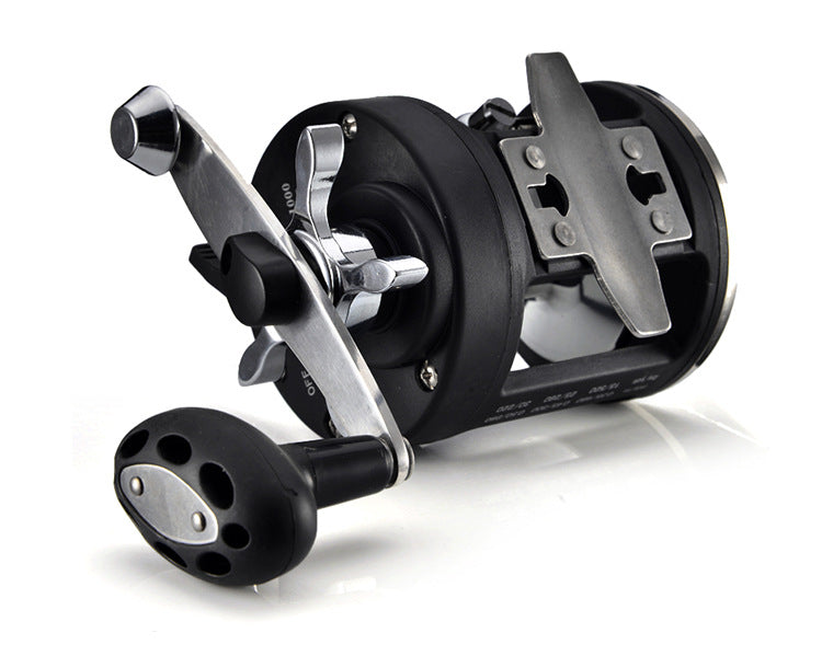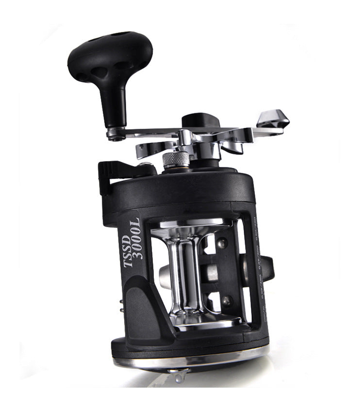 Available in right-hand and left-hand versions, this black metal trolling reel fits freshwater (bass/pike) and saltwater (tuna/mackerel) trolling—with centrifugal brake, full carbon drag, and CNC parts for big-game use.