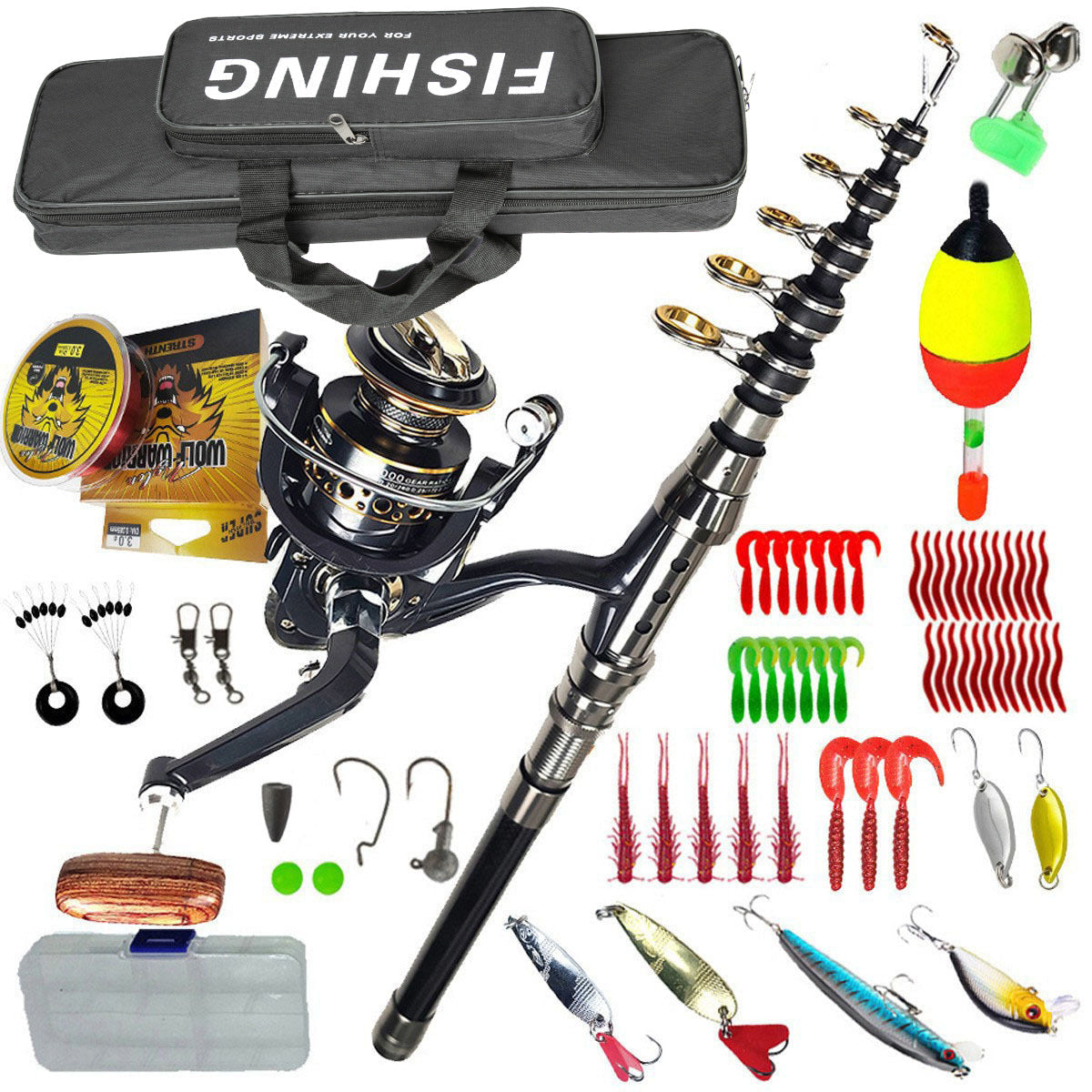 Type B: Rod*1 Reel*1 Line*100meters/328'(nylon) Rod Bag*1 Minnow*2 Soft Bait*47 Spoon*4 Accessories*7